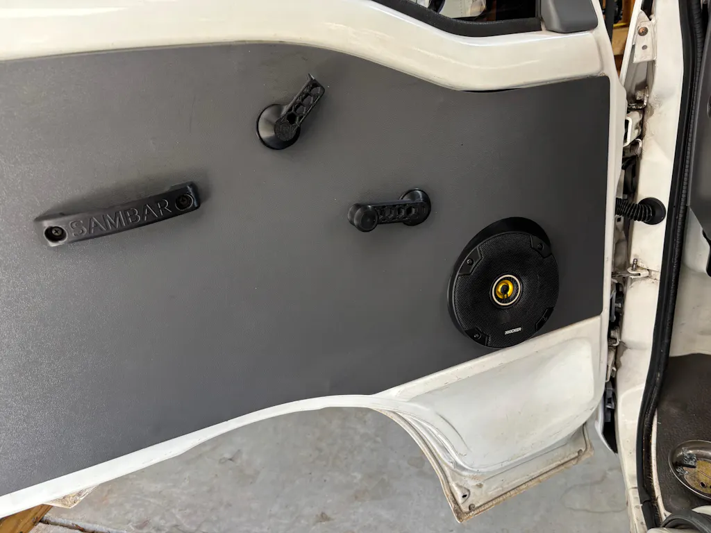 After installing two Kicker 4x6 speakers in my dash and an Alpine head unit I was left wanting more, so I added more. I created a custom two piece speaker mount to house 5.25" Kicker speakers in the front doors. They are angled slightly up and towards the back of the vehicle to help deliver the sound to your ears instead of your legs.